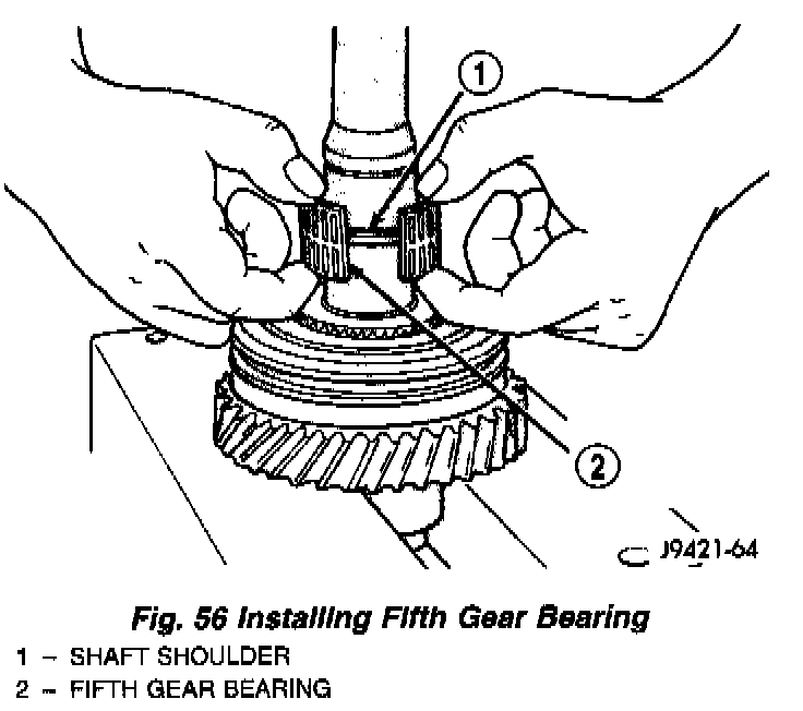 11. Install fifth gear bearing. Spread bearing only enough to clear shoulder on output shaft (Fig. 56). Be sure bearing is properly seated after installation.