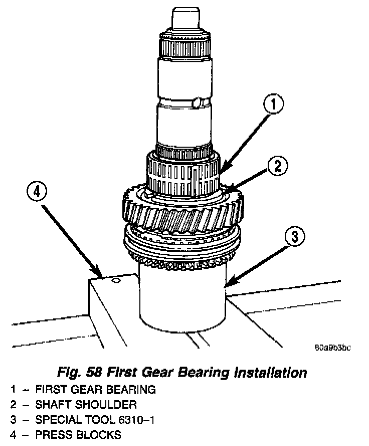 14. Install first gear bearing on output shaft (Fig. 58). Be sure bearing is seated on shaft shoulder and is properly joined.