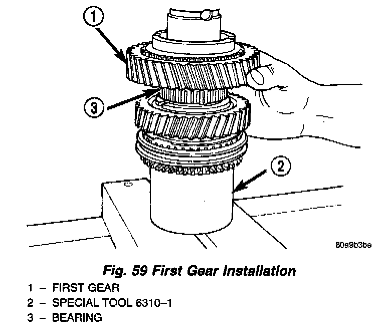 15. Install first gear on shaft and over bearing (Fig. 59). Make sure bearing synchro cone is facing up as shown.