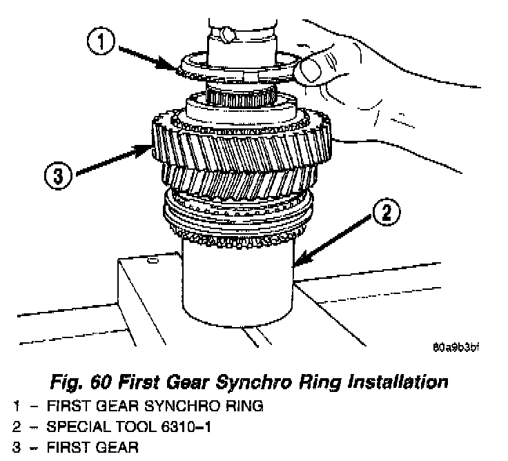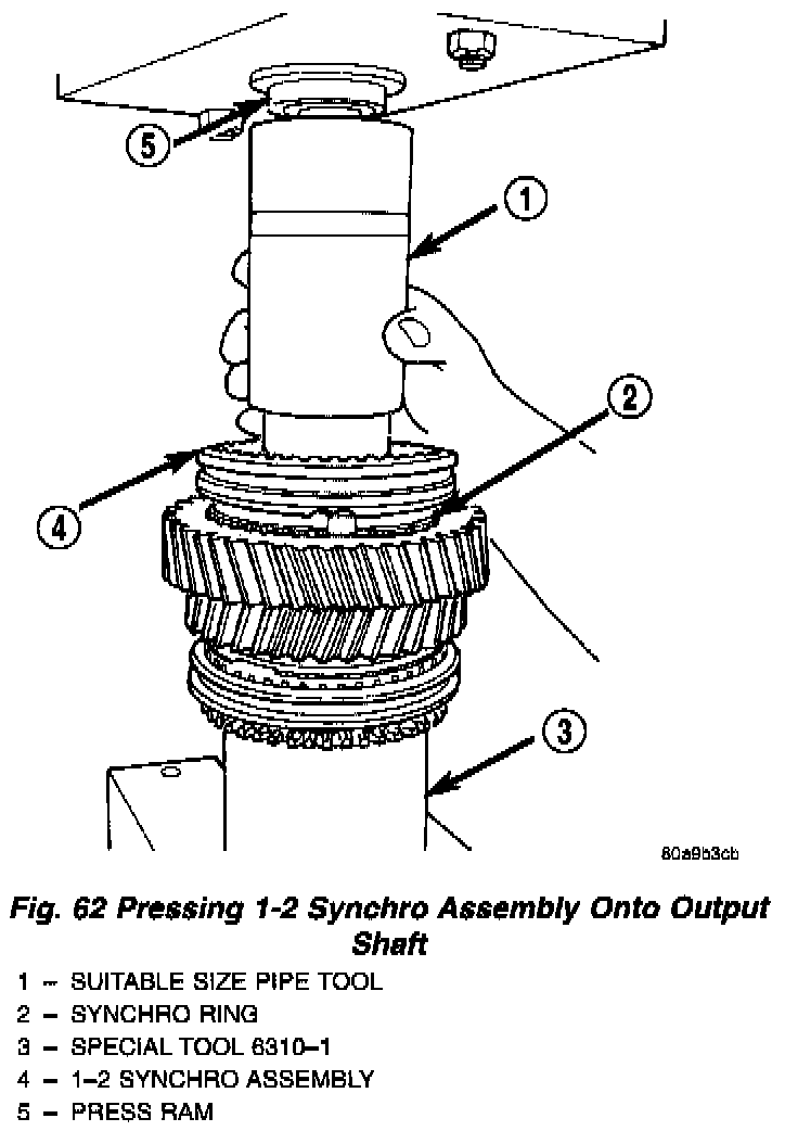 19. Press 1-2 synchro onto output shaft using suitable size pipe tool and shop press (Fig. 62).