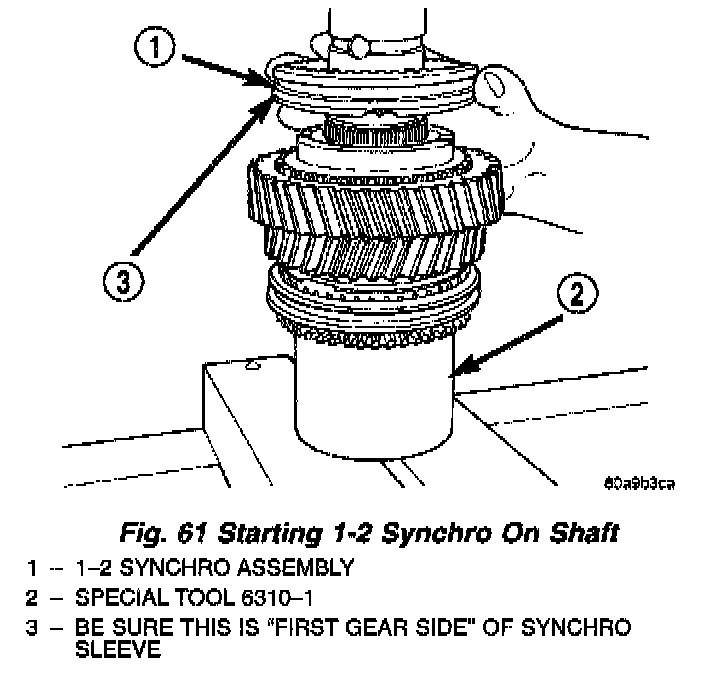 18. Start 1-2 synchro assembly on shaft by hand (Fig. 61). Be sure synchro sleeve is properly positioned. Side marked first side must be facing first gear.