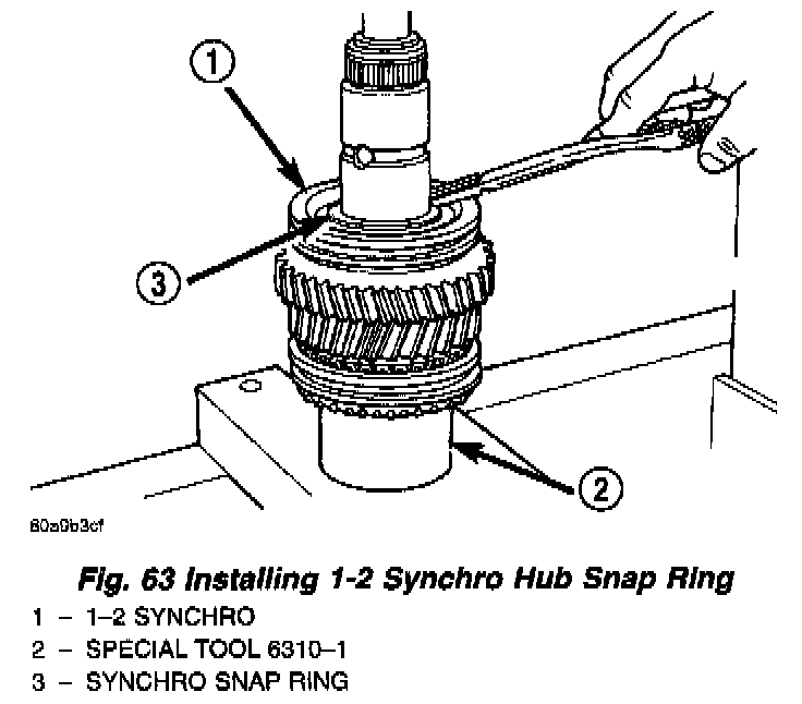 21. Install new 1-2 synchro hub snap ring (Fig. 63) as follows: