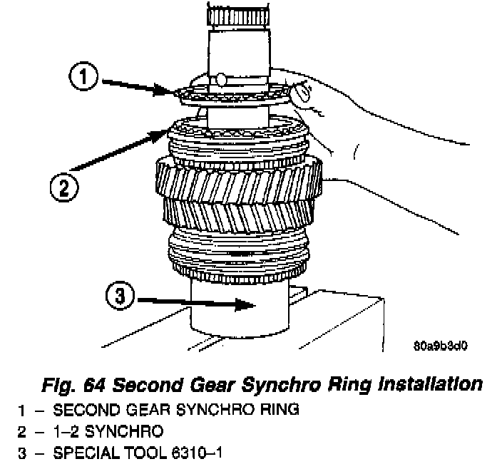 22. Install second gear synchro ring in 1-2 synchro hub and sleeve (Fig. 64). Be sure synchro ring is properly seated in sleeve.