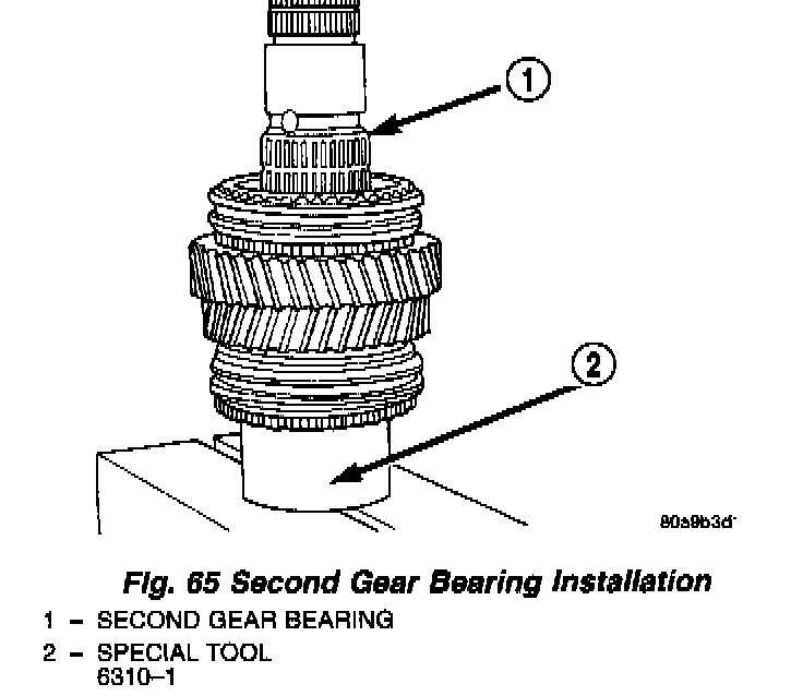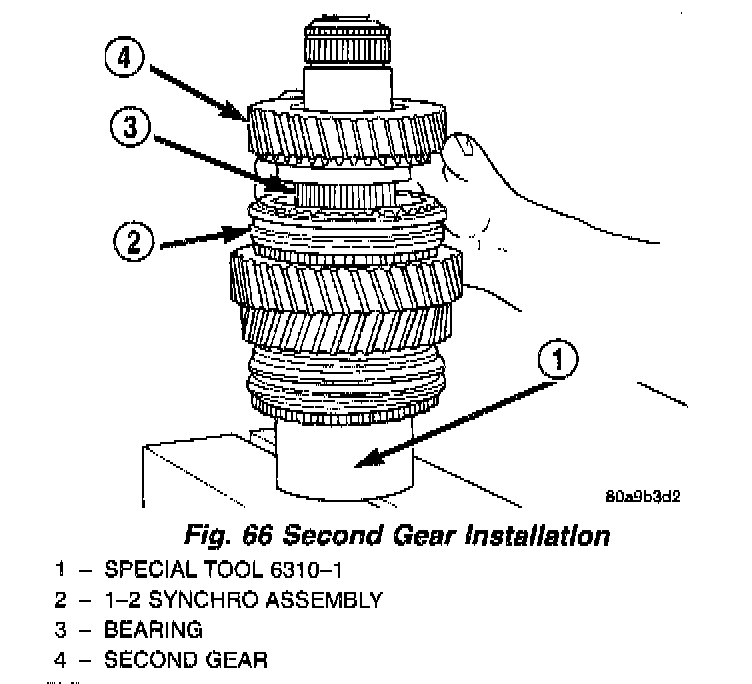 25. Install second gear onto shaft and bearing (Fig. 66). Make sure that second gear is fully seated on synchro components.