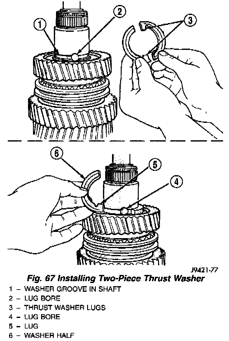 26. Install two-piece thrust washer (Fig. 67). Be sure washer halves are seated in shaft groove and that washer lugs are seated in shaft lug bores. Also, ensure that the I.D. grooves and markings noted during removal are facing the correct direction.