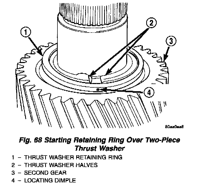 27. Start retaining ring around two-piece thrust washer (Fig. 68). Make sure that the locating dimple is between the thrust washer halves.