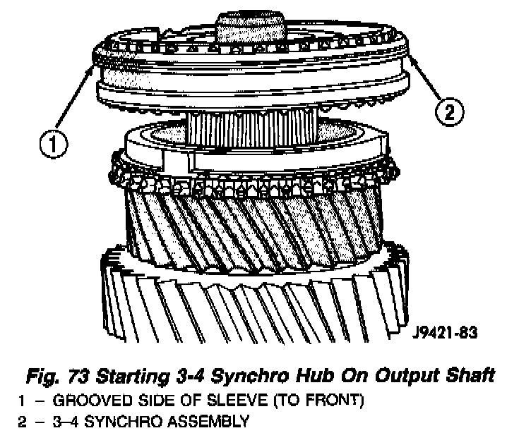 33. Start 3-4 synchro hub on output shaft splines by hand (Fig. 73).