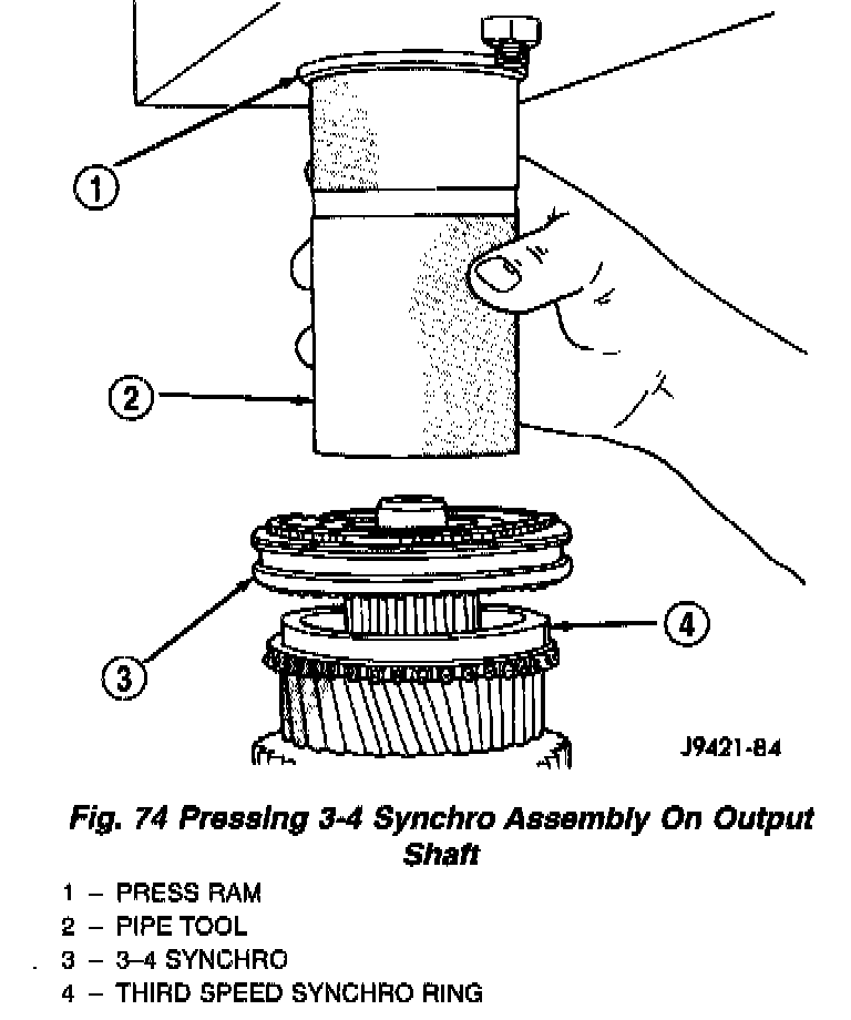 34. Press 3-4 synchro assembly onto output shaft with shop press and suitable size pipe tool (Fig. 74). Make sure that the tool presses on hub as close to output shaft as possible but does not contact the shaft splines.