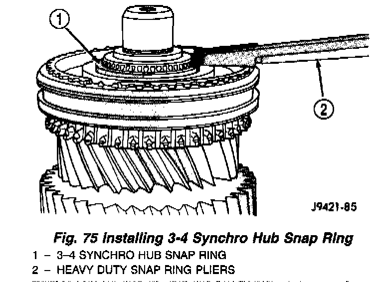 35. Install 3-4 synchro hub snap ring (Fig. 75) as follows: