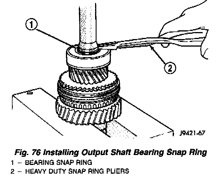 37. Install output shaft bearing snap ring (Fig. 76). Use heavy duty snap ring pliers and spread snap ring only enough to install it. Be sure snap ring is completely seated in shaft groove before proceeding.