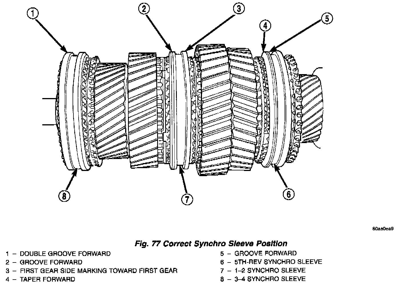 38. Verify correct position of synchro sleeves before proceeding with assembly operations (Fig. 77). Grooved side of 3-4 sleeve should be facing forward. First gear side of 1-2 sleeve should be facing first gear. Tapered side of fifth-reverse sleeve should be facing forward.