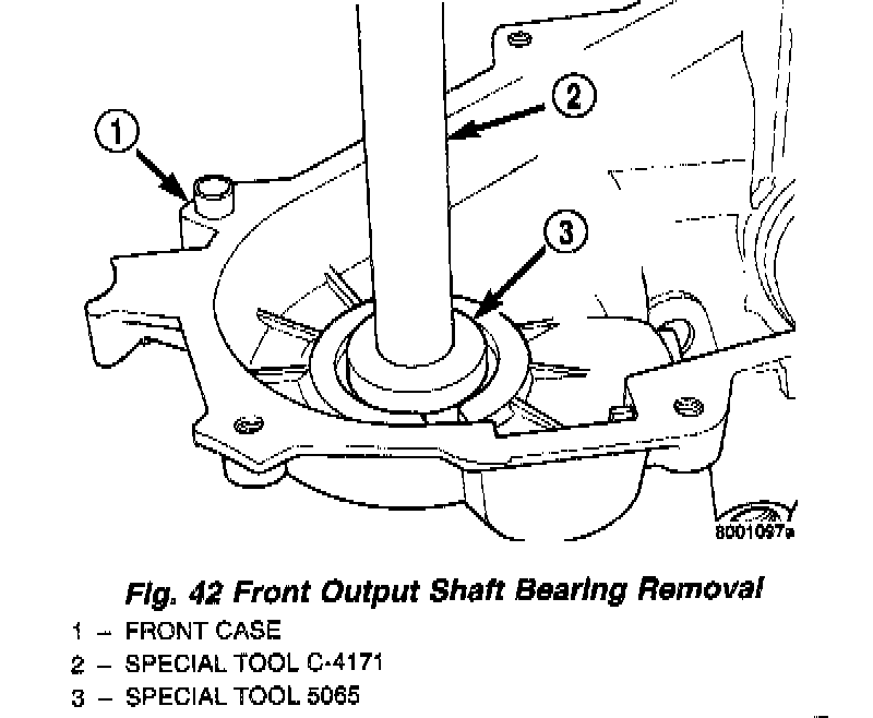 3. Remove bearing with Tool Handle C-4171 and Tool 5065 (Fig. 42).