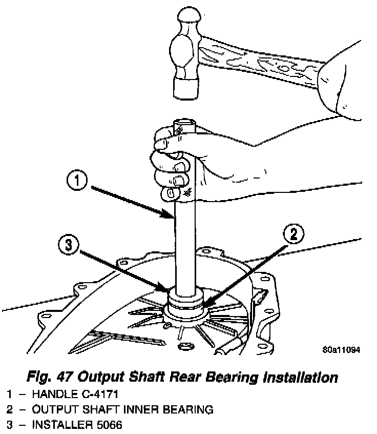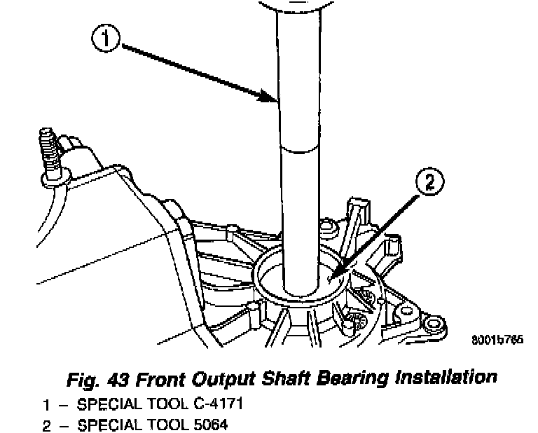 4. Install front output shaft front bearing in case with Tool Handle C-4171 and Installer 5064 (Fig. 43).