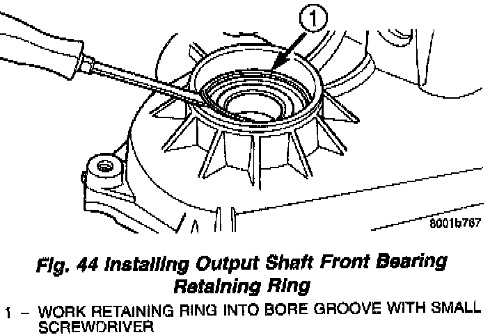 5. Install output shaft front bearing retaining ring (Fig. 44). Start ring into place by hand. Then use small screwdriver to work ring into case groove. Be sure ring is fully seated before proceeding.