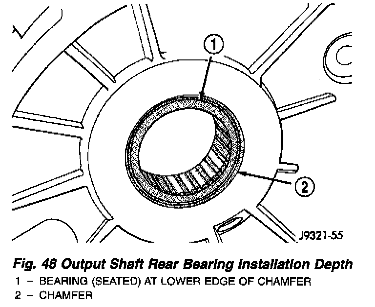 8. Install new bearing with Tool Handle C-4171 and Installer 5066 (Fig. 47). The bearing bore is chamfered at the top. Install the bearing so it is flush with the lower edge of this chamfer (Fig. 48).