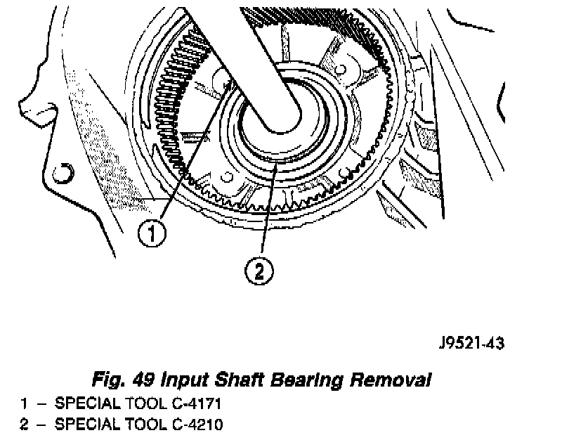 9. Using Remover C-4210 and Handle C-4171, drive input shaft bearing from inside the annulus gear opening in the case (Fig. 49).