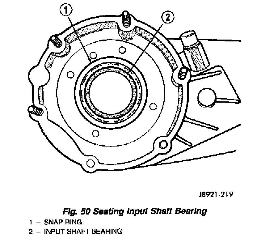 12. Using Remover C-4210 and Handle C-4171, drive input shaft bearing into case. The bearing locating ring must be fully seated against case surface (Fig. 50).