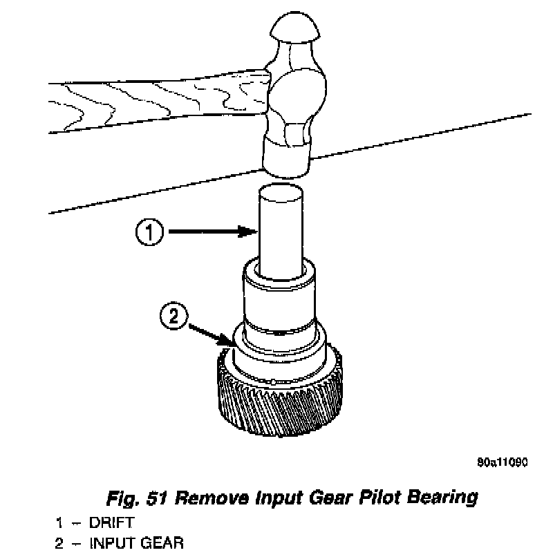 13. Remove input gear pilot bearing by inserting a suitably sized drift into the splined end of the input gear and driving the bearing out with the drift and a hammer (Fig. 51).