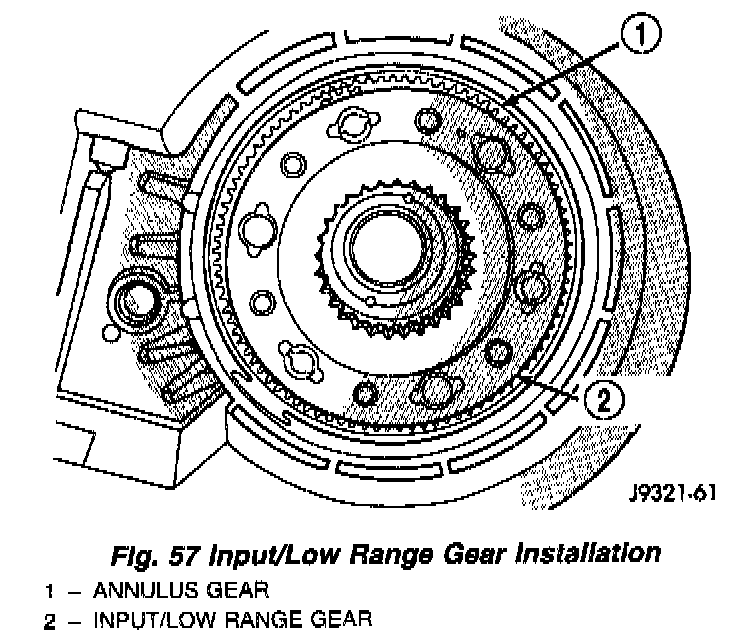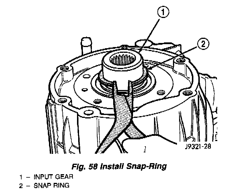 2. Install snap-ring to hold input/low range gear into front bearing (Fig. 58).