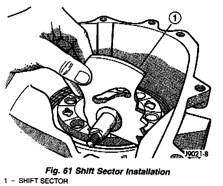 2. Install shift sector in case (Fig. 61). Lubricate sector shaft with transmission fluid before installation.