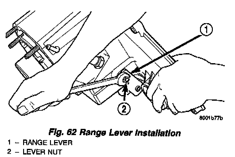 3. Install range lever, washer, and nut on sector shaft (Fig. 62). Tighten range lever nut to 27 - 34 Nm (20 - 25 ft. lbs.) torque.