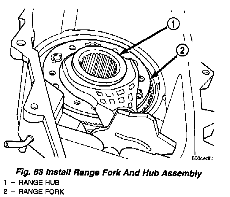 4. Assemble and install range fork and hub (Fig. 63). Be sure hub is properly seated in low range gear and engaged to the input gear.