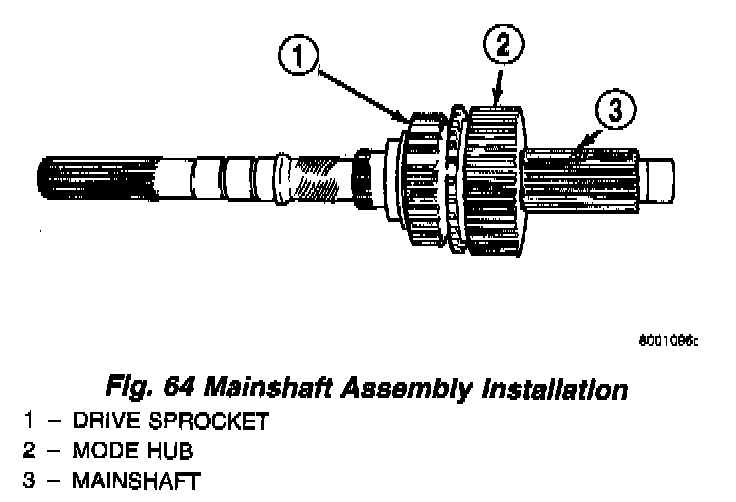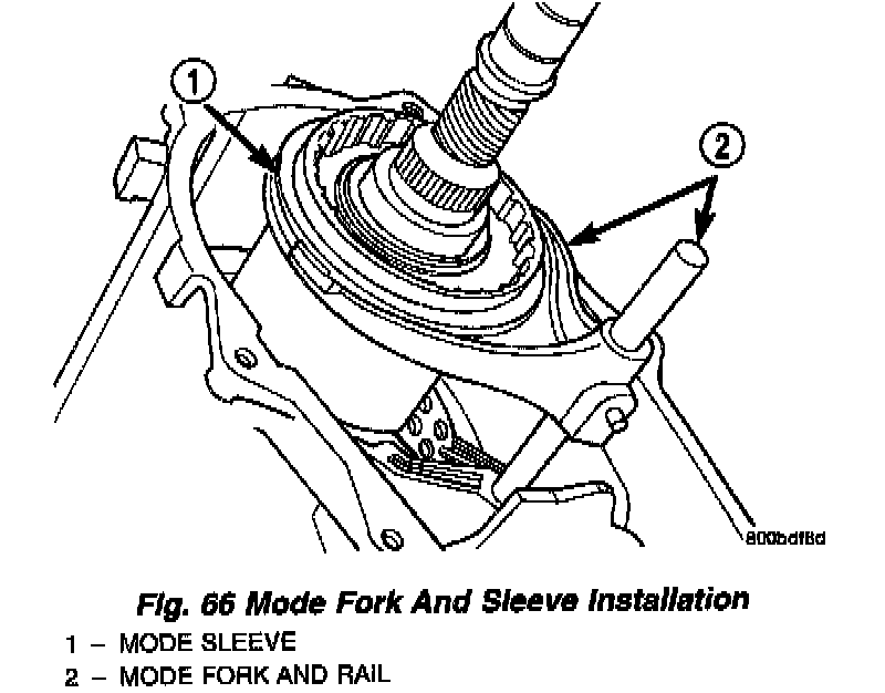 9. Install assembled mode fork and sleeve (Fig. 66). Be sure fork rail goes through range fork and into case bore. Also be sure sleeve is aligned and seated on mainshaft hub.