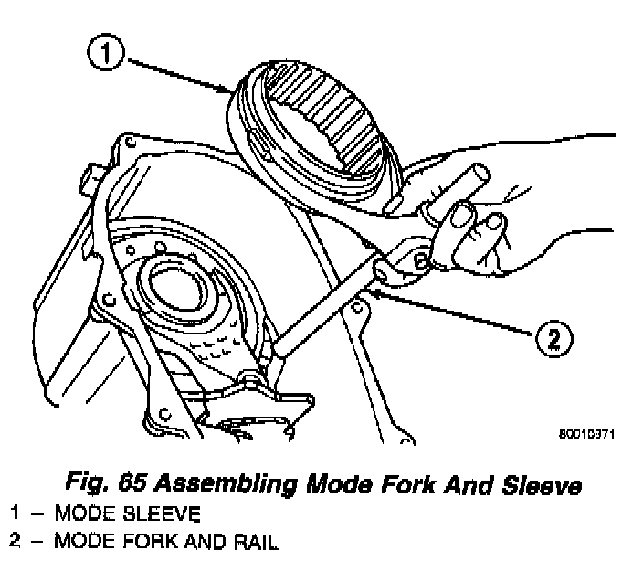 8. Insert mode sleeve in mode fork mode fork. Be sure long side of sleeve is toward long end of shift rail (Fig. 65).
