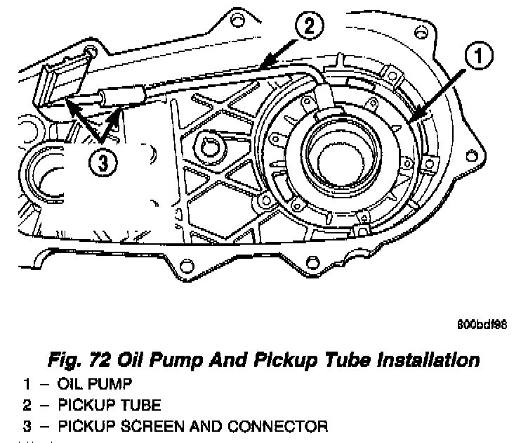 5. Position assembled oil pump and pickup tube in rear case. Be sure pickup screen is securely seated in case slot. Also be sure oil pump locating tabs are outside rear case (Fig. 72).