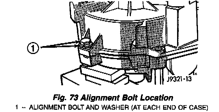 8. Install case attaching bolts. Alignment bolts at each end of case are only ones requiring washers (Fig. 73).