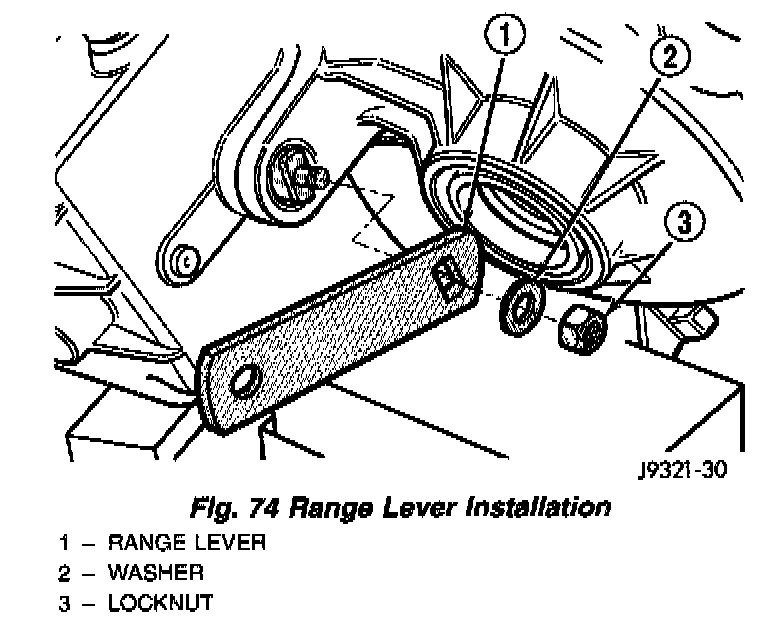 2. Install range lever, washer and locknut on sector shaft (Fig. 74). Tighten locknut to 27 - 34 Nm (20 - 25 ft. lbs.) torque.