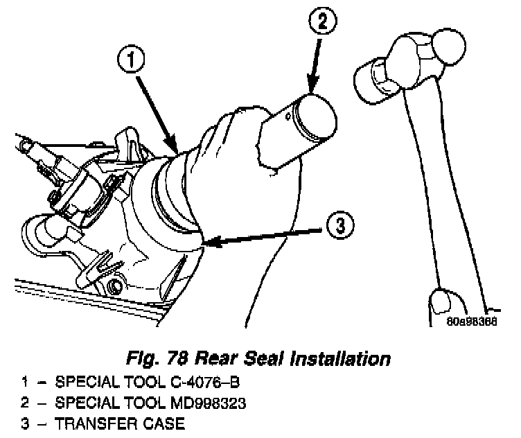 6. Slide Installer C-4076-B onto seal protector with the recessed side of the tool toward the seal. Drive seal into rear bearing retainer with Installer C-4076-B and Handle MD-998323 (Fig. 78).