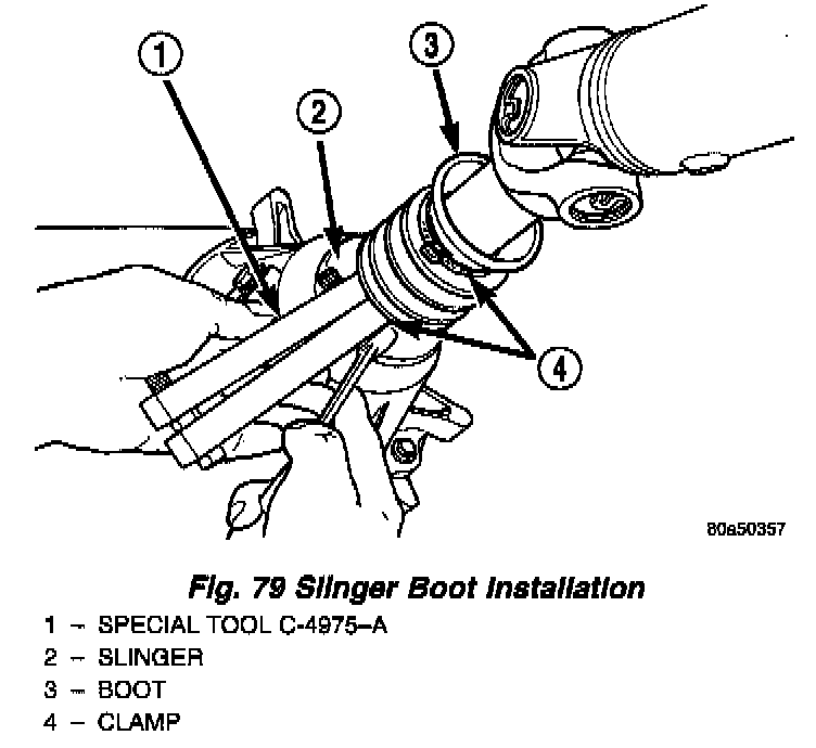 8. Install boot on output shaft slinger and crimp retaining clamp with tool C-4975-A (Fig. 79).