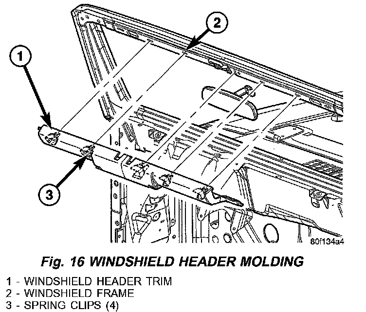 2. Using a trim stick C-4755 or equivalent, separate the retaining clips and remove the trim from behind the a-pillar trim panels. (Fig. 16)