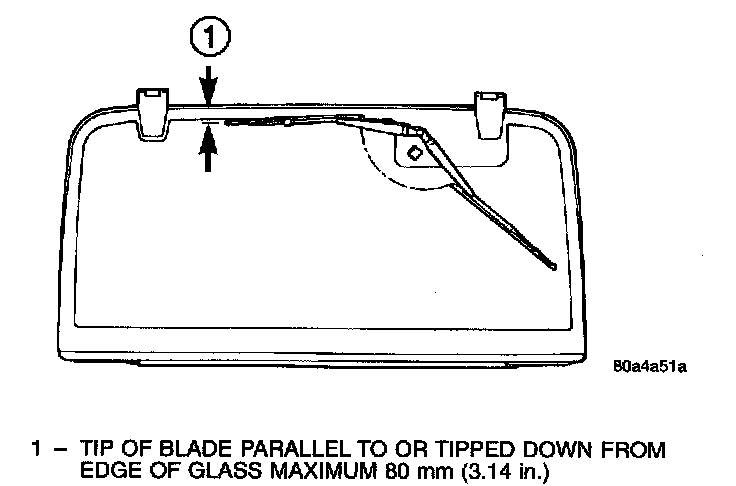 3. Install the rear wiper arm with the wiper motor in the Park position. Place the rear wiper blade on the lift glass so that it is parallel to or tipped down from the upper edge of the lift glass a maximum of 80 mm (3.14 in).