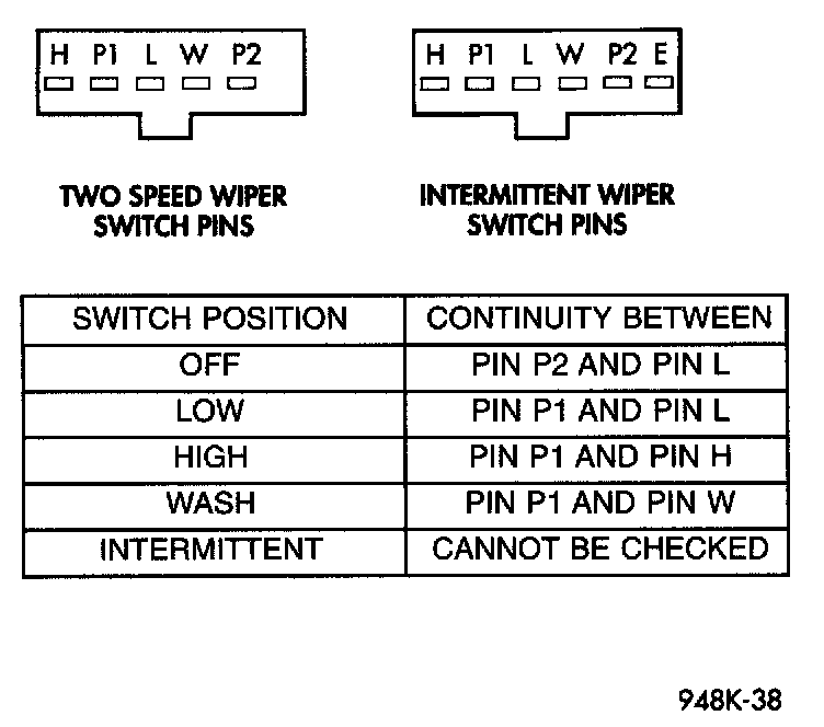 3. Using an ohmmeter, perform the switch continuity checks at the switch terminals as shown in the Windshield Wiper Switch and Washer Switch Continuity chart.