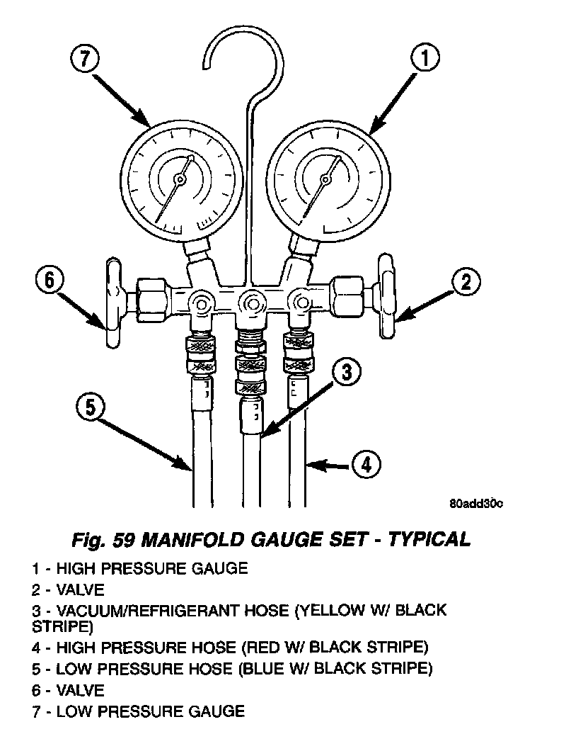 A manifold gauge set may be needed with some recovery/recycling/charging equipment. The service hoses on the gauge set being used should have manual (turn wheel), or automatic back-flow valves at the service port connector ends. This will prevent refrigerant from being released into the atmosphere.