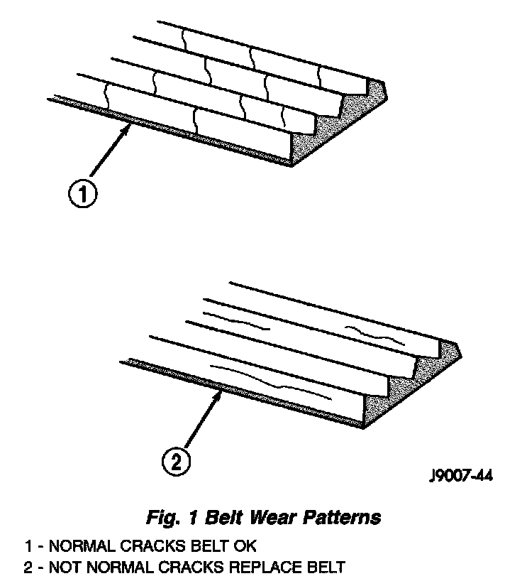 VISUAL DIAGNOSISWhen diagnosing serpentine accessory drive belts, small cracks that run across the ribbed surface of the belt from rib to rib (Fig. 1), are considered normal. These are not a reason to replace the belt. However, cracks running along a rib (not across) are not normal. Any belt with cracks running along a rib must be replaced (Fig. 1). Also replace the belt if it has excessive wear, frayed cords or severe glazing.