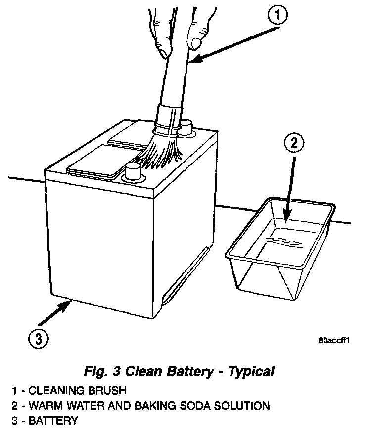 3. If the removed battery is to be reinstalled, clean the outside of the battery case and the top cover with a sodium bicarbonate (baking soda) and warm water cleaning solution using a stiff bristle parts cleaning brush to remove any acid film (Fig. 3). Rinse the battery with clean water. Ensure that the cleaning solution does not enter the battery cells through the vent holes. If the battery is being replaced, refer to Battery Specifications for the factory-installed battery specifications. Confirm that the replacement battery is the correct size and has the correct ratings for the vehicle.