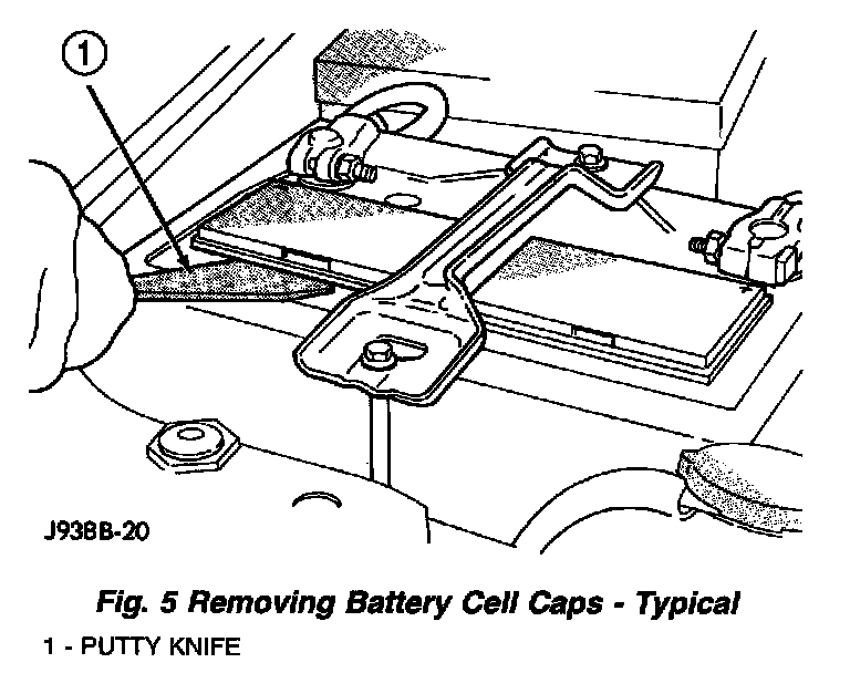 5. Inspect the electrolyte level in the battery. Use a putty knife or another suitable wide flat-bladed tool to pry the cell caps off (Fig. 5). DO NOT USE A SCREWDRIVER. Add distilled water to each battery cell until the liquid reaches the bottom of the vent well or one centimeter above the battery plates. DO NOT OVERFILL THE BATTERY CELLS.