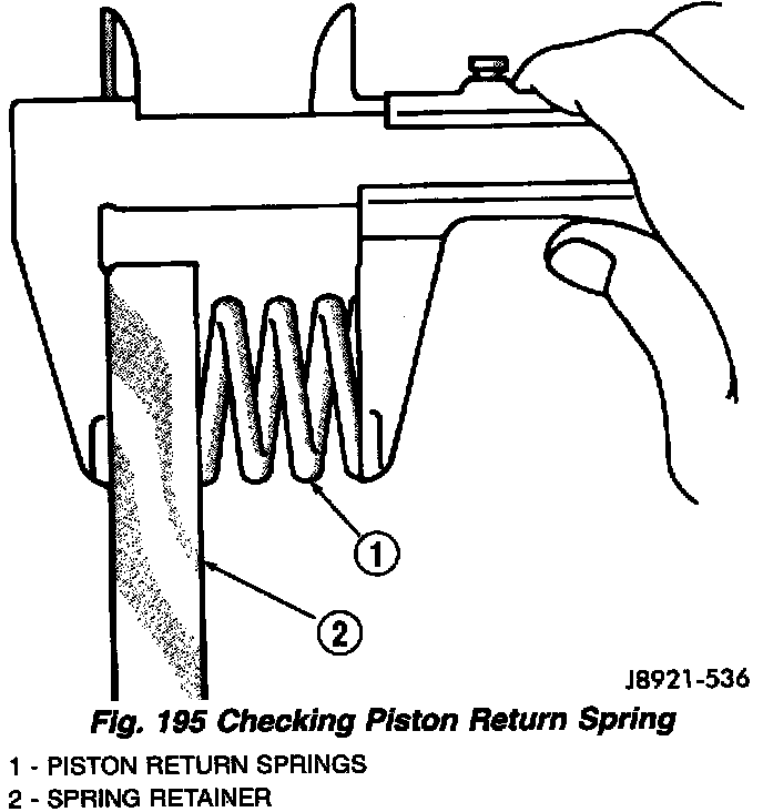 12. Measure free length of piston return springs with springs in retainer (Fig. 195). Length should be 16.8 mm (0.661 inch). Replace spring and retainer assembly if necessary.
