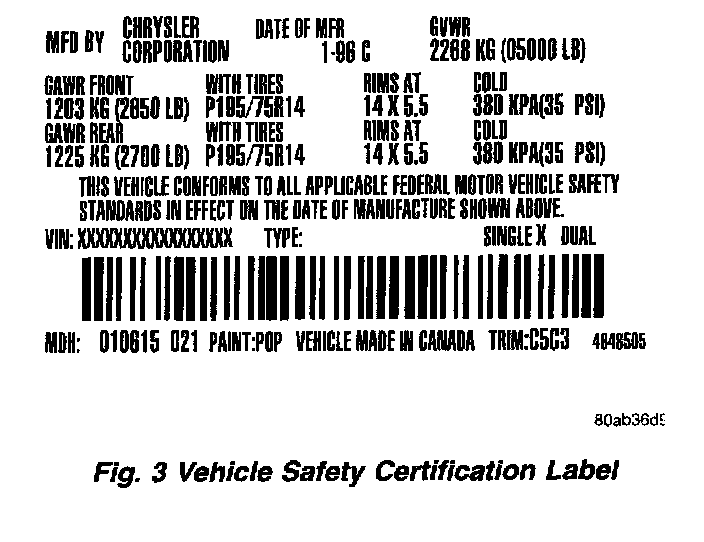 A vehicle safety certification label (Fig. 3) is attached to every Chrysler Corporation vehicle. The label certifies that the vehicle conforms to all applicable Federal Motor Vehicle Safety Standards. The label also lists: