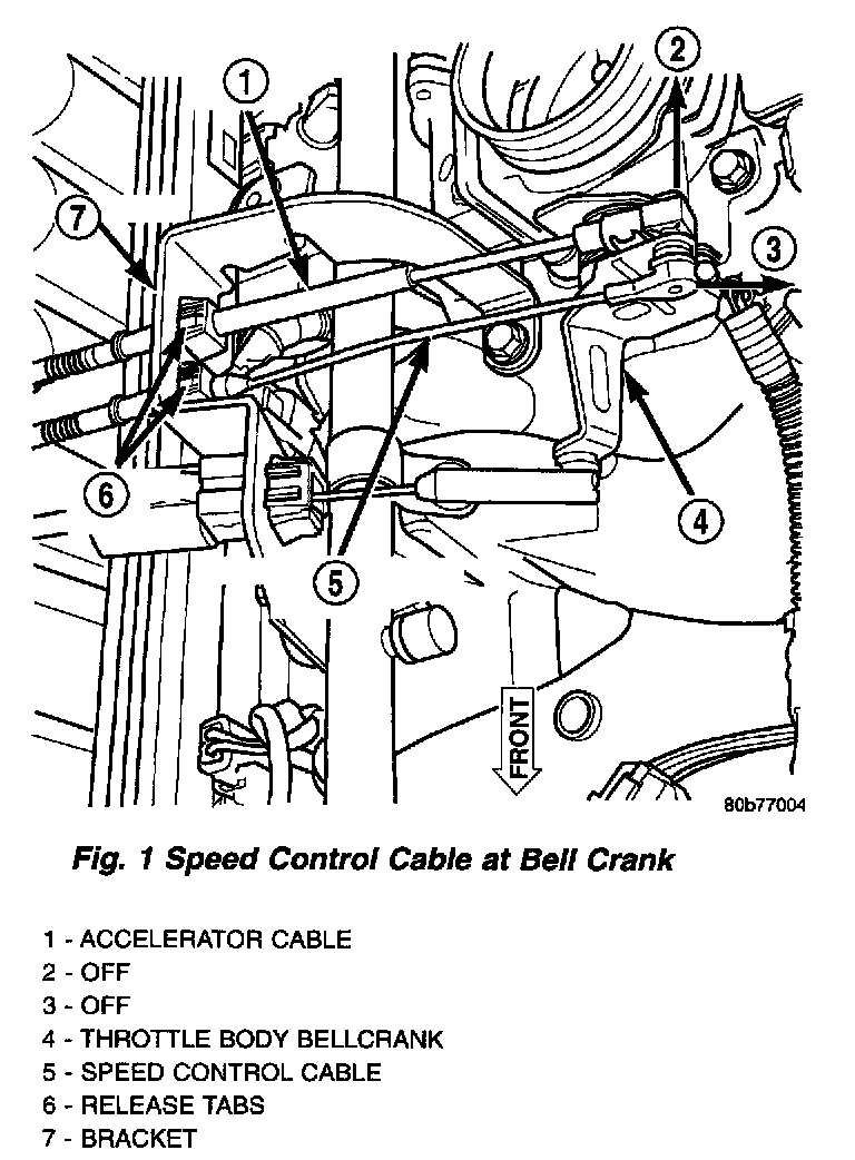 3. Using finger pressure only, remove speed control cable connector at throttle body bellcrank pin by pushing connector OFF bellcrank pin towards drivers side of vehicle. DO NOT try to pull connector OFF perpendicular to the bellcrank pin. Connector will be broken.