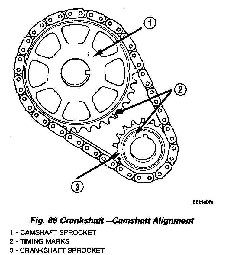 6. Rotate crankshaft until the "0" timing mark is closest to and on the center line with camshaft sprocket timing mark (Fig. 88).