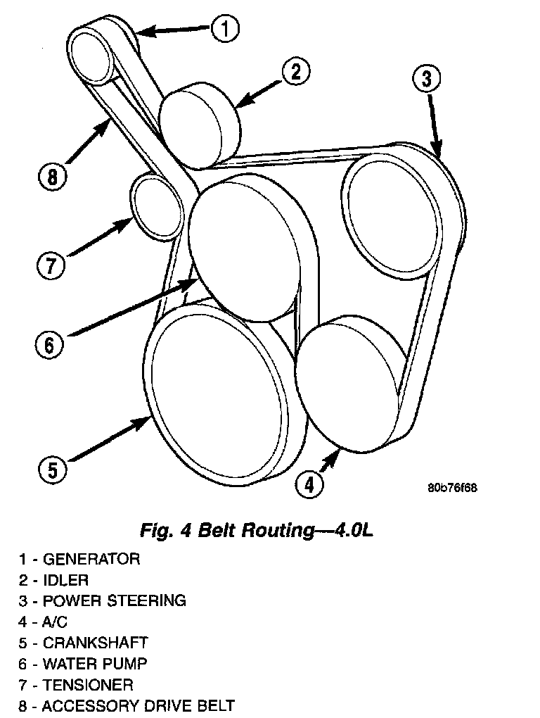 CAUTION: When installing the serpentine accessory drive belt, the belt MUST be routed correctly. If not, the engine may overheat due to the water pump rotating in the wrong direction (Fig. 4).