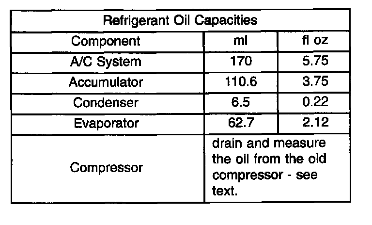 Refrigerant oil must be added when a accumulator, evaporator coil, or condenser are replaced. See the Refrigerant Oil Capacities chart. When a compressor is replaced, the refrigerant oil must be drained from the old compressor and measured. Drain all of the refrigerant oil from the new compressor, then fill the new compressor with the same amount of refrigerant oil that was drained out of the old compressor.