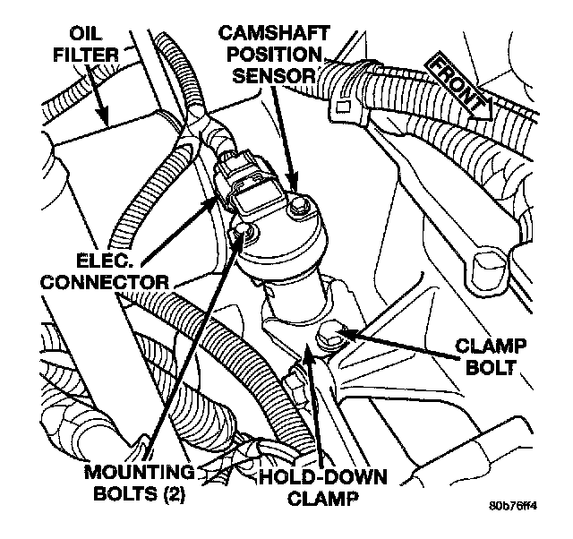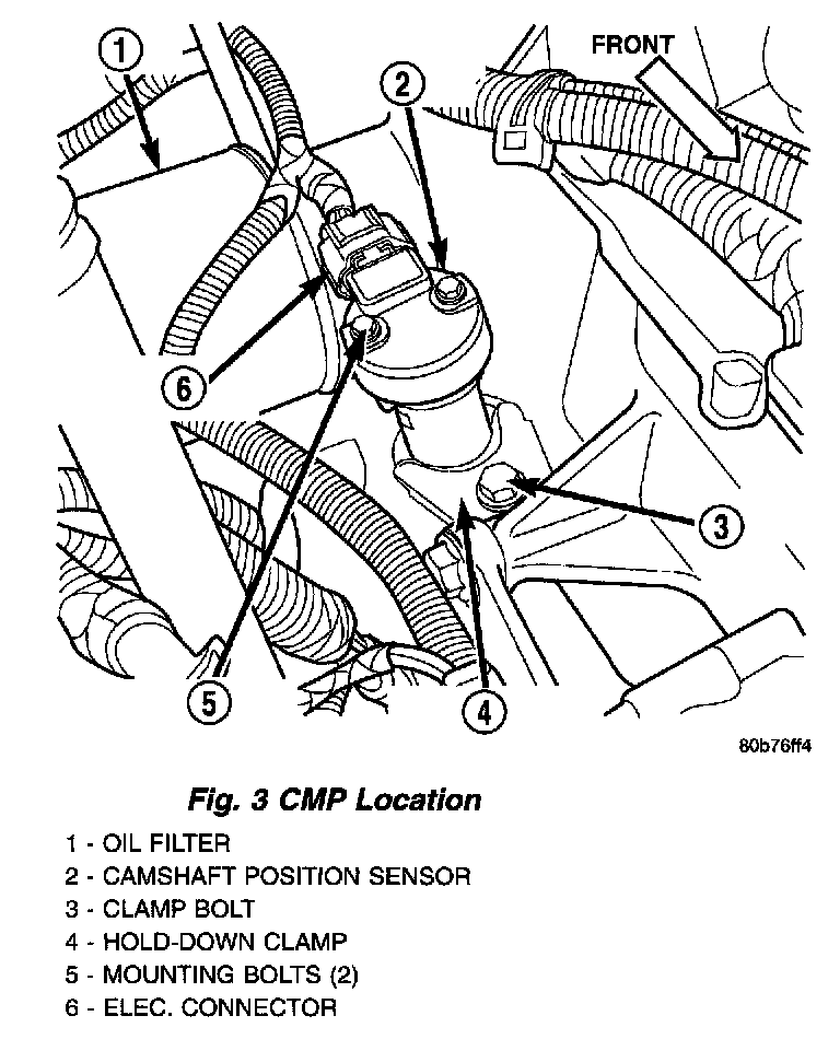 The Camshaft Position Sensor and drive shaft assembly is located on the right side of the engine near the oil filter.