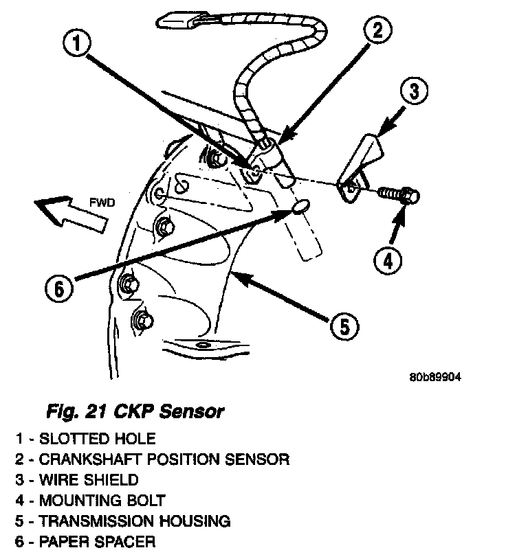 The Crankshaft Position (CKP) sensor is mounted to the transmission bellhousing at the left(rear side of the engine block. The sensor is adjustable and is attached with one bolt. A wire shield/router is attached to the sensor.