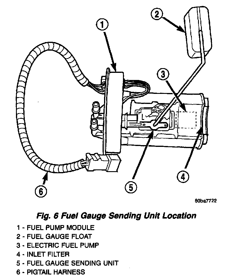 The fuel gauge sending unit (fuel level sensor) is attached to the side of the fuel pump module.