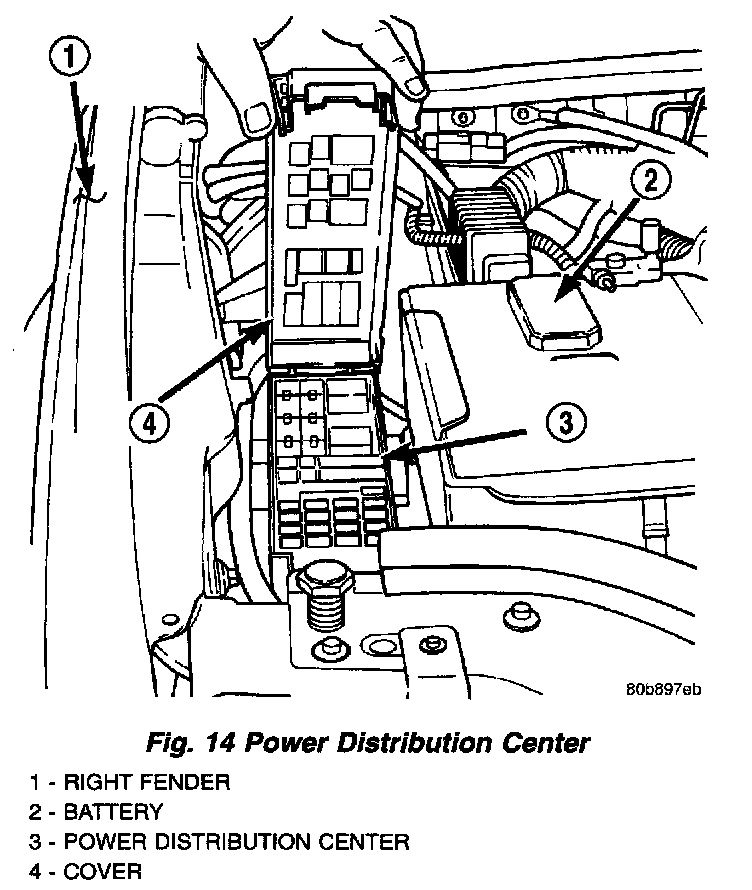 2. Remove the cover from the Power Distribution Center (PDC) (Fig. 14).